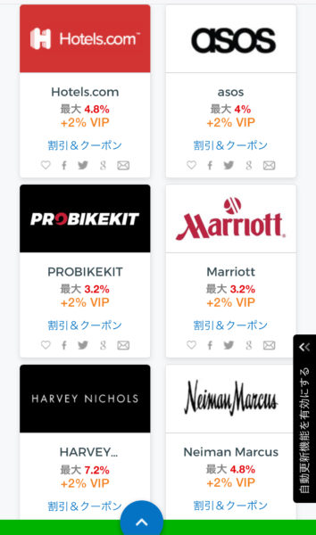 しかも、大手ネットショッピングサイトはもちろん、ゲームサイト・スポーツブランド、大手ホテル予約サイトに旅行代理店も入っているので、もうこのサイトだけで生活のすべて事足りる(笑)くらいな勢いです!